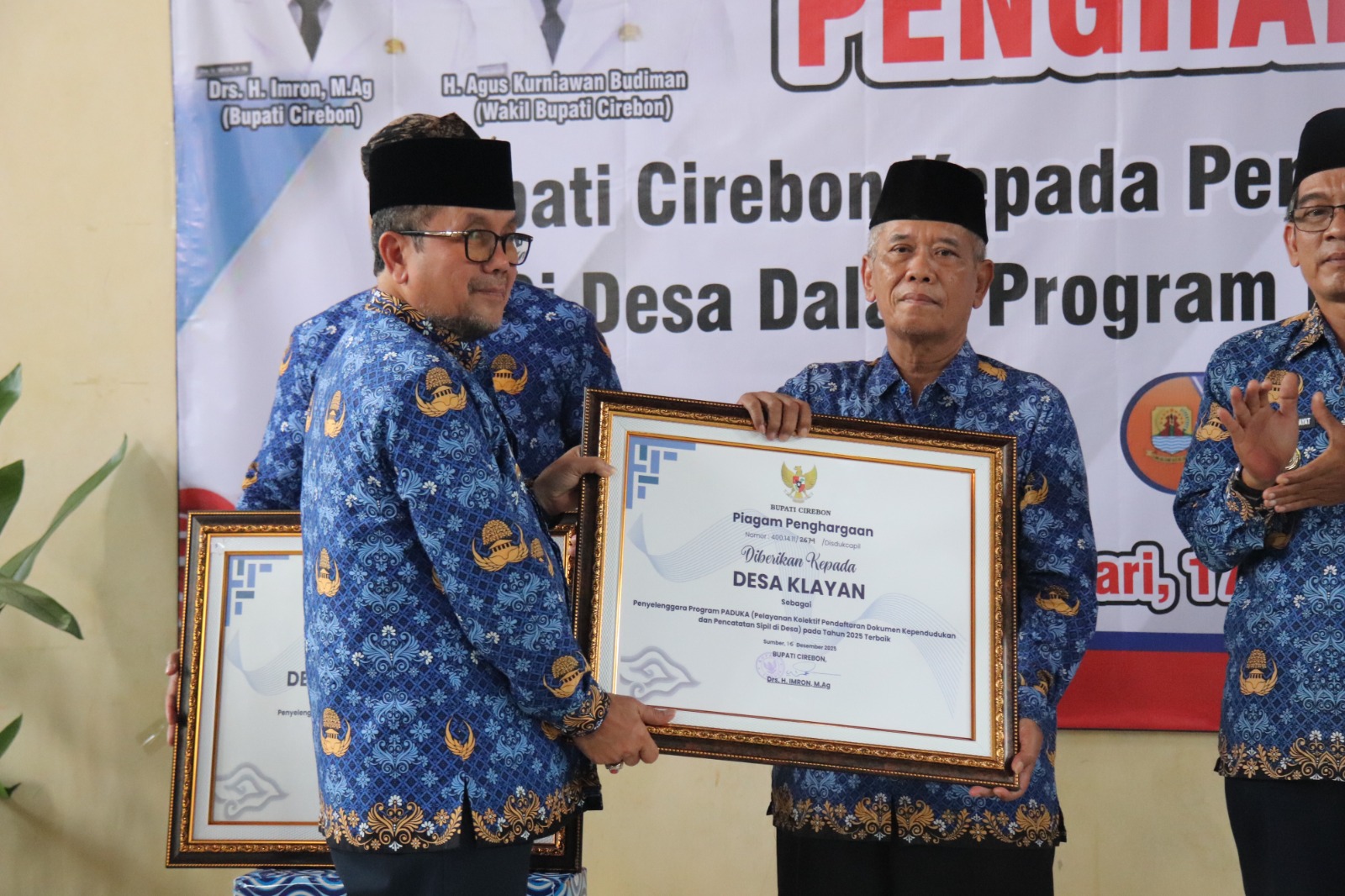 CIREBON – Bupati Cirebon Imron, bersama Dinas Kependudukan dan Pencatatan Sipil (Disdukcapil), memberikan apresiasi kepada tiga desa di tiga kecamatan yang dinilai berprestasi dalam pelayanan administrasi kependudukan, Rabu (17/12/2025).