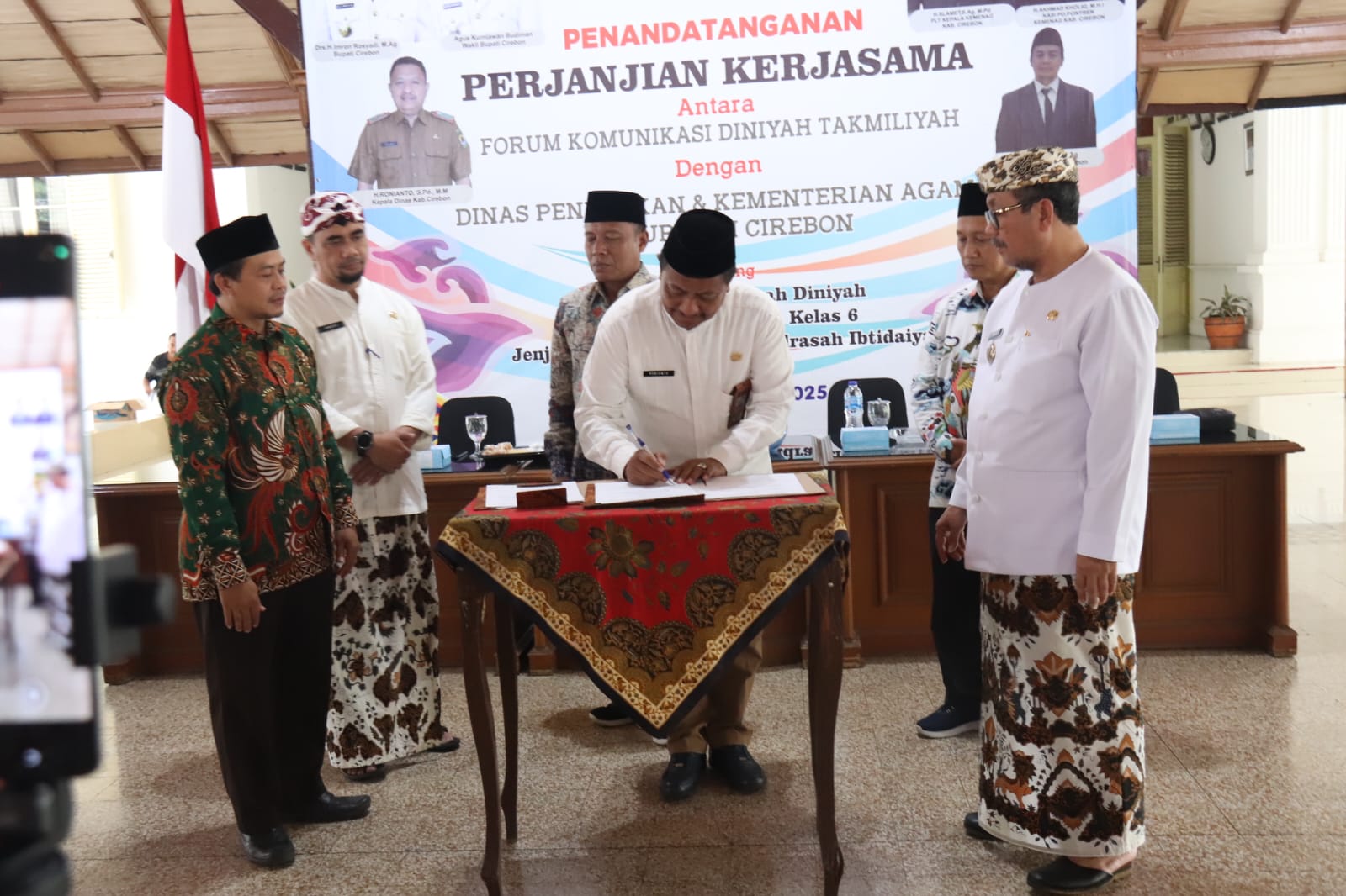 CIREBON- Pemerintah Kabupaten (Pemkab) Cirebon menguatkan komitmennya dalam perkuat pendidikan karakter dan keagamaan dengan lakukan penandatanganan Nota Kesepahaman (MoU) terkait program belajar diniyah bagi siswa sekolah dasar (SD), Kamis (19/6/2025).